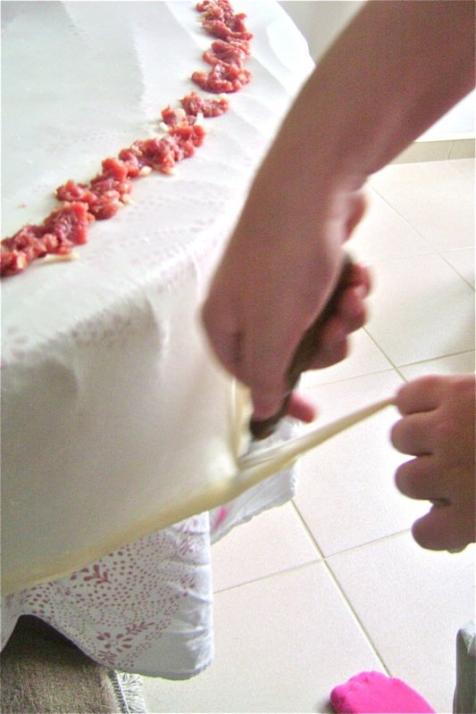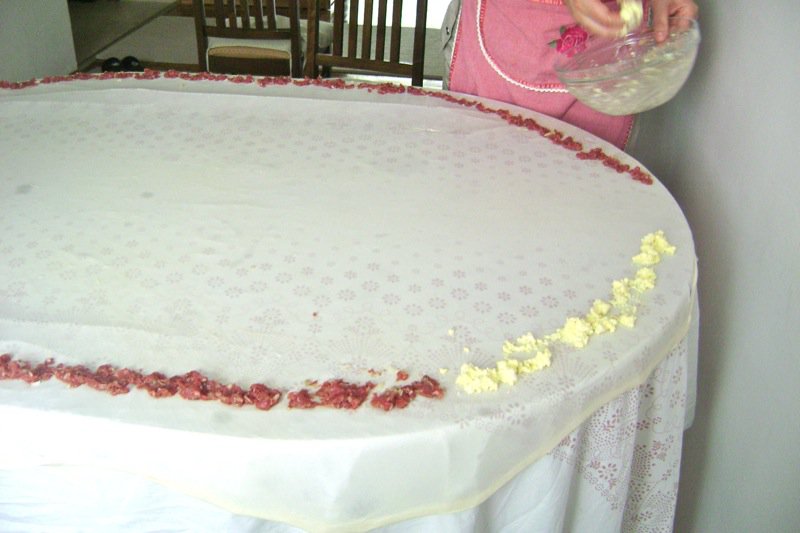 Emina is setting up the paper and taking charge of the burek making. She is showing her mother and me how much her grandmother has taught her.