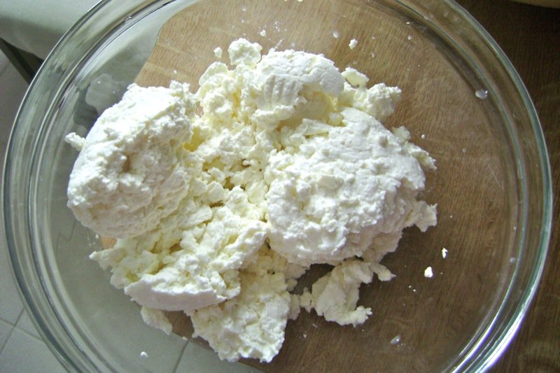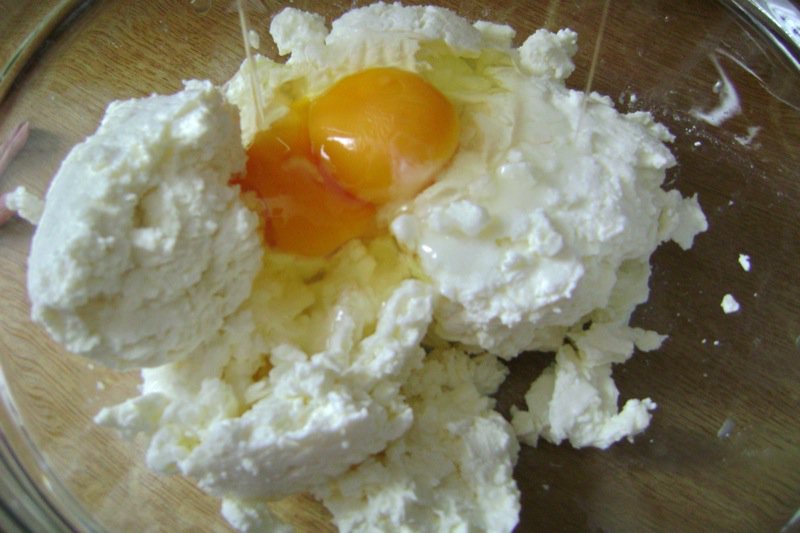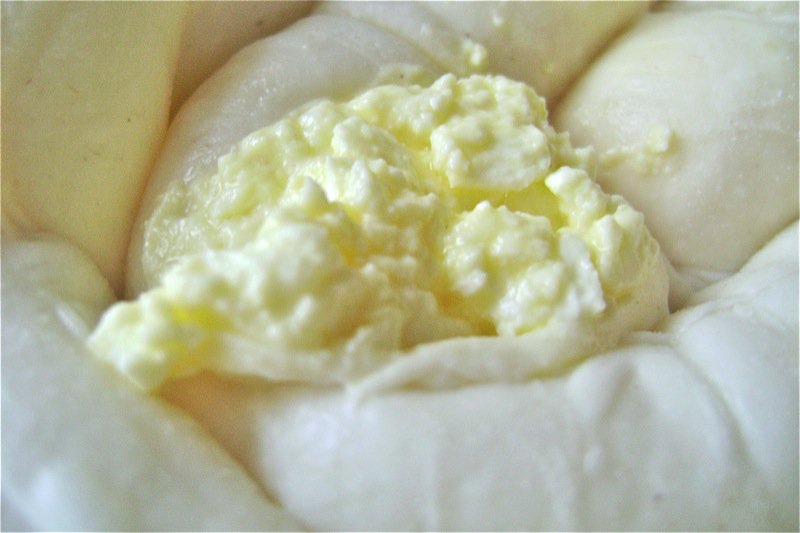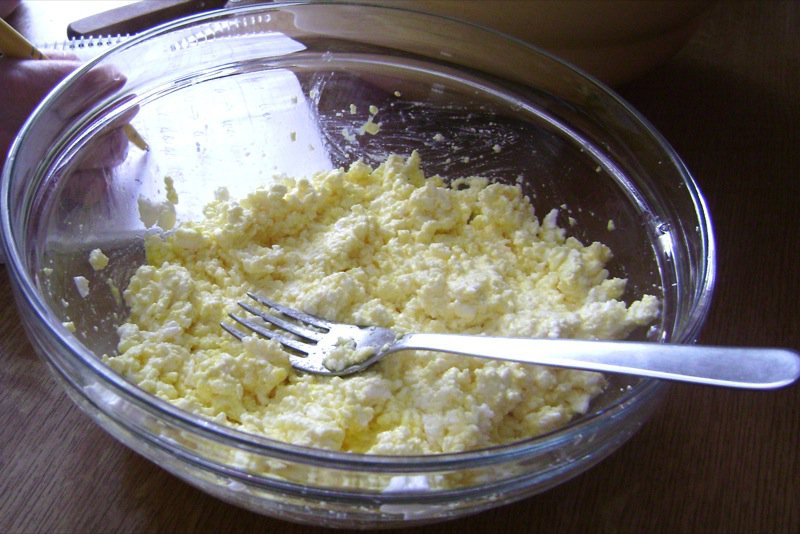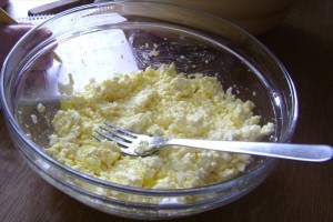 While the dough rests, we make the cheese filling with the mladi sir. Ako told me it was the same thing as cottage cheese, but there is nothing like this cheese in out stores. It is very delicate and lovely. Below, it is broken with a fork.