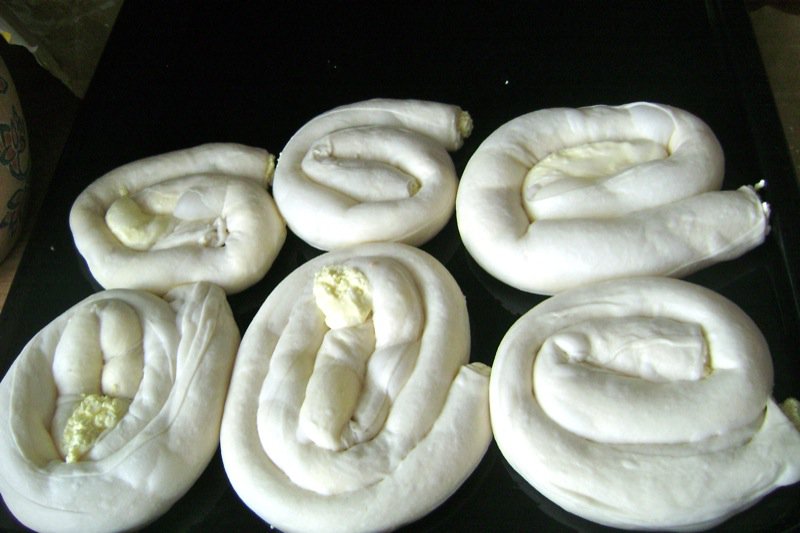 - Use the butter and oil to grease the baking pan; roll each end of the two ropes of dough into two burek portions and leave enough in the middle for a third