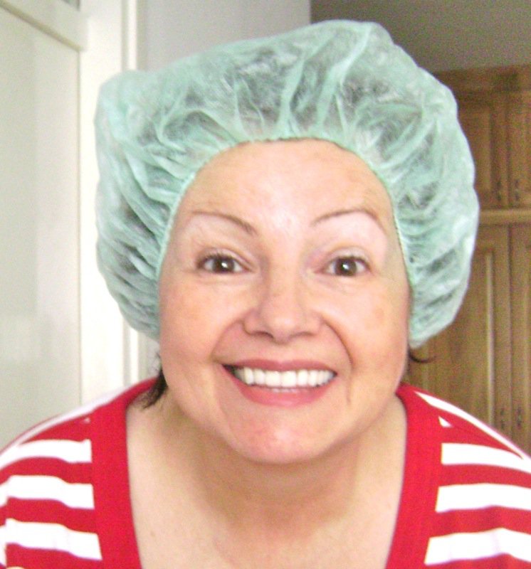 At this point, Elsada explained that the woman always wears a marama when making burek. It is the old fashioned scarf you see on TV when some of the village women are wearing their traditional garb. Then she went on to explain that she and Emina wear these caps to keep their hair out of the burek and the pita. I was thrilled! It drives me crazy to find a little hair in anything and I am vehement in my classroom about my students having their hair up and off of their face securely. Brilliant idea! What fun! Look at me! We definitely had a few giggles here.