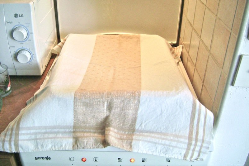 The burek is resting under the tea towel staying hot for our breakfast while Elsada butters the last batch.