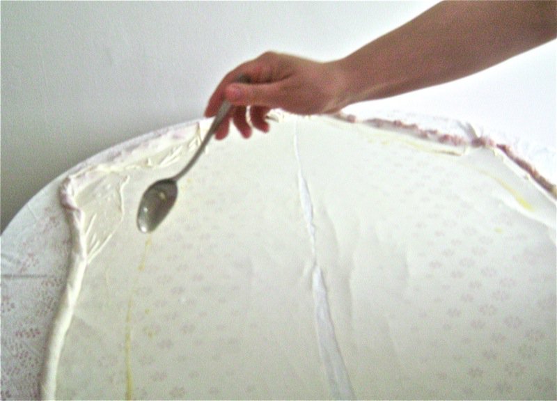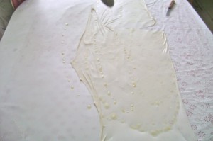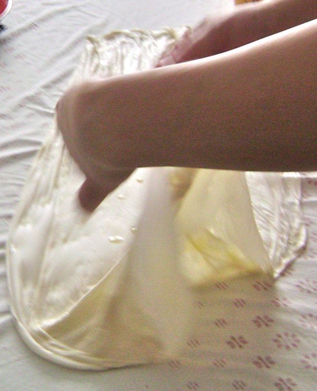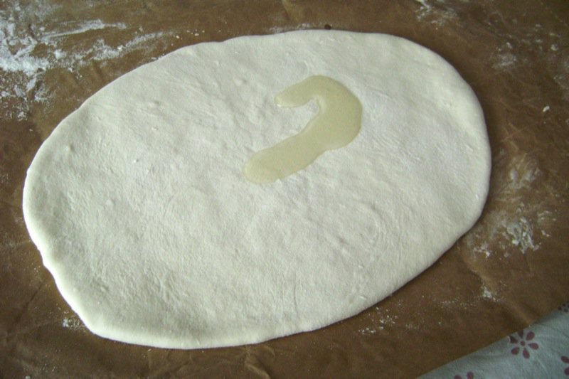 - Spread oil over the surface of each rolled pastry oval very lightly, but cover the entire surface area to enable easy stretching later