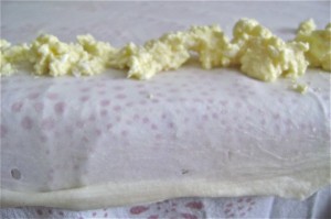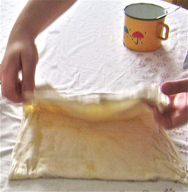 - Add the oil to the melted butter and sprinkle just a little over the pastry on each portion (make a circle with the sprinkling)