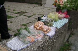 There were just three cars selling today. See them, above, left. They had produce and products in their open trunks and on the ledge beside the sidewalk. None of this milk or cheese in pasteurized. Lovely, old, wisened toothless farmers with smiles that welcomed us immediately. Ako was looking for a firm mladi sir. I was looking for a lighter one. One with a lot of bounce and give. He said the one I picked wasn’t good. (I think it was, but I have learned I still have a lot to learn.) He also bought some smoked cheese. He loves it and wanted me to taste it.