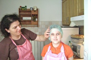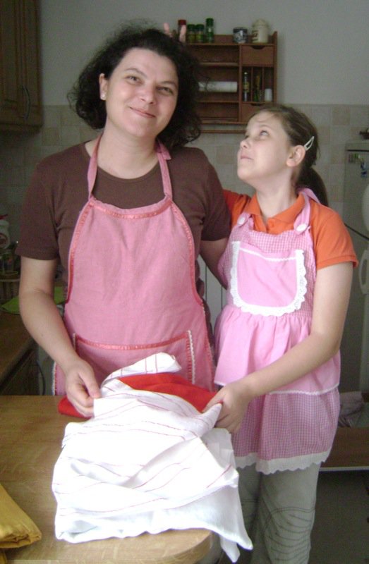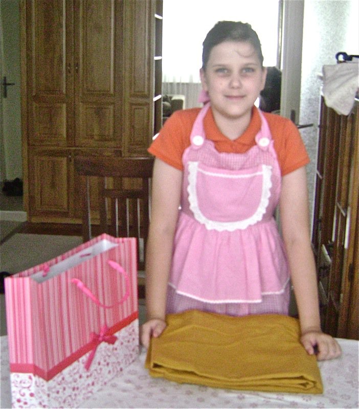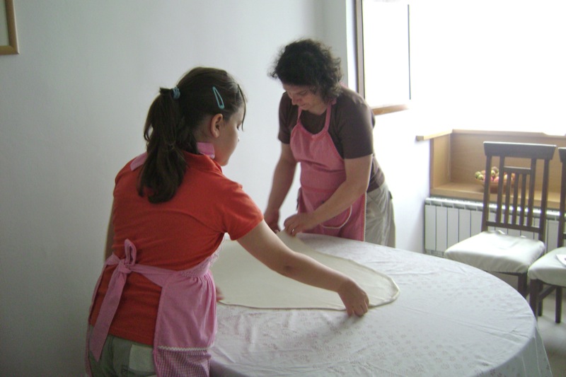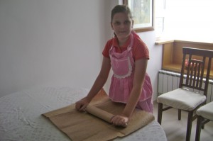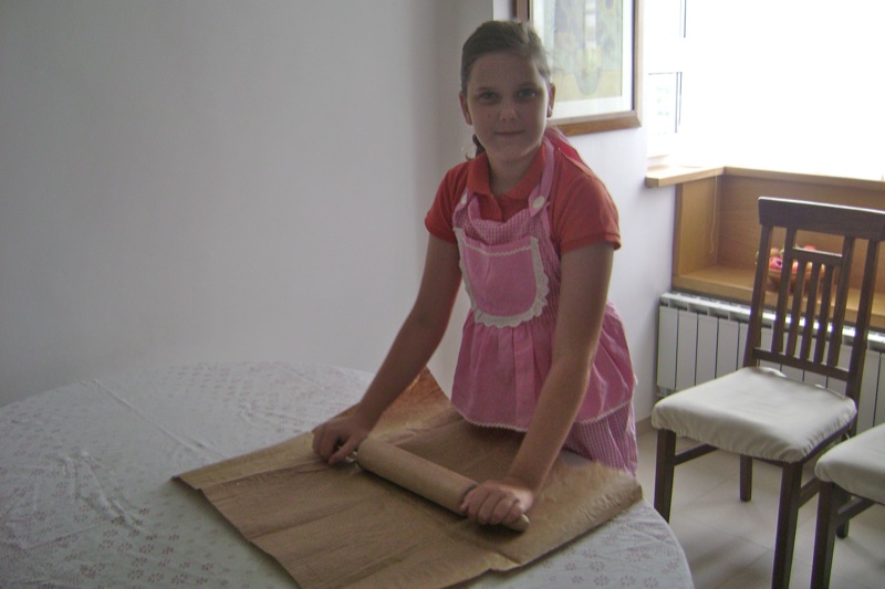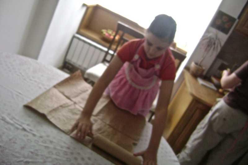 Once again, we started. I had brought aprons as gifts for mommy and Emina. Emina had grown so much in one year that her apron hardly fit her. She is a very special child and her grandmother (Elsada’s mother) has worked with her and taught her to make this dough for the traditional meat pie (burek) and cheese pie (sir pita) as it is said in that area: