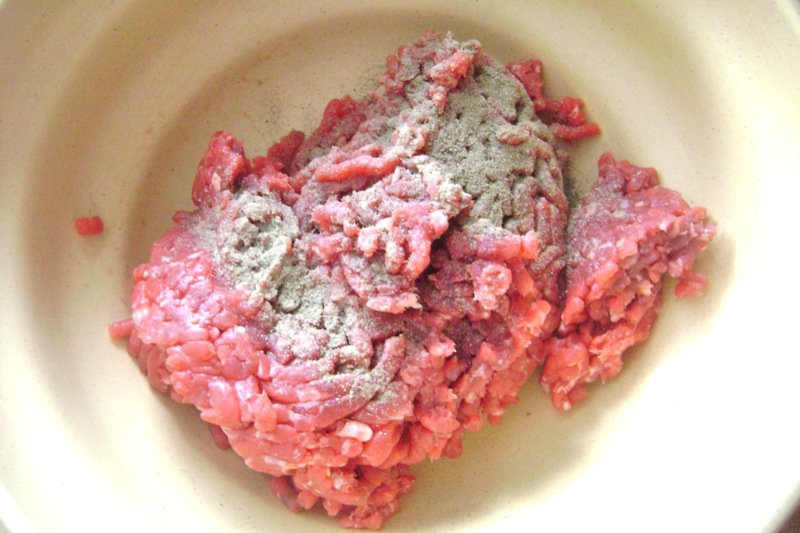 The ingredients are very simple and straightforward: onion, garlic, sparkling mineral water, salt and pepper and the best beef possible with some flavourful fat.