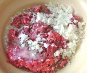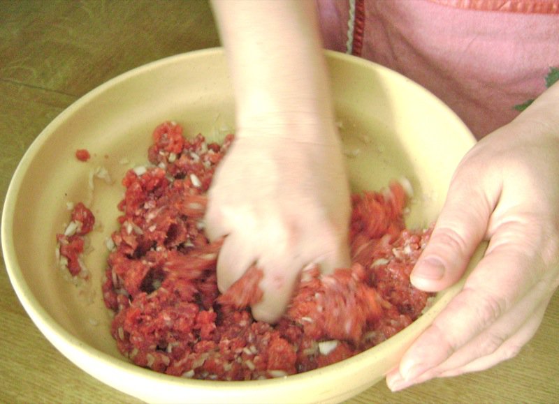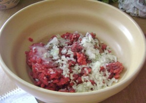 - Rest for 15 minutes (and not more than 5 minutes longer) and prepare the meat (mince the onion and mix all ingredients together)
