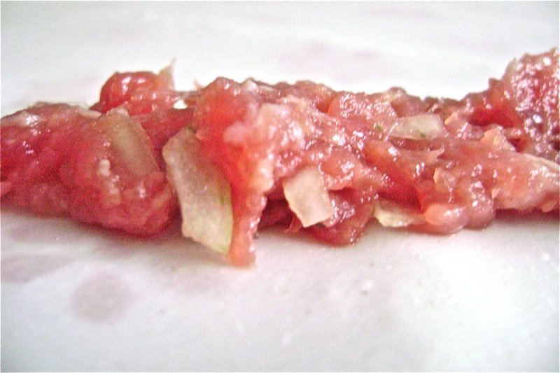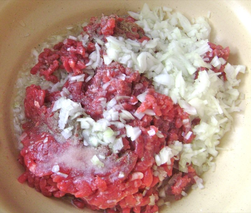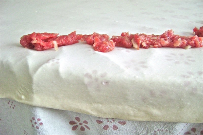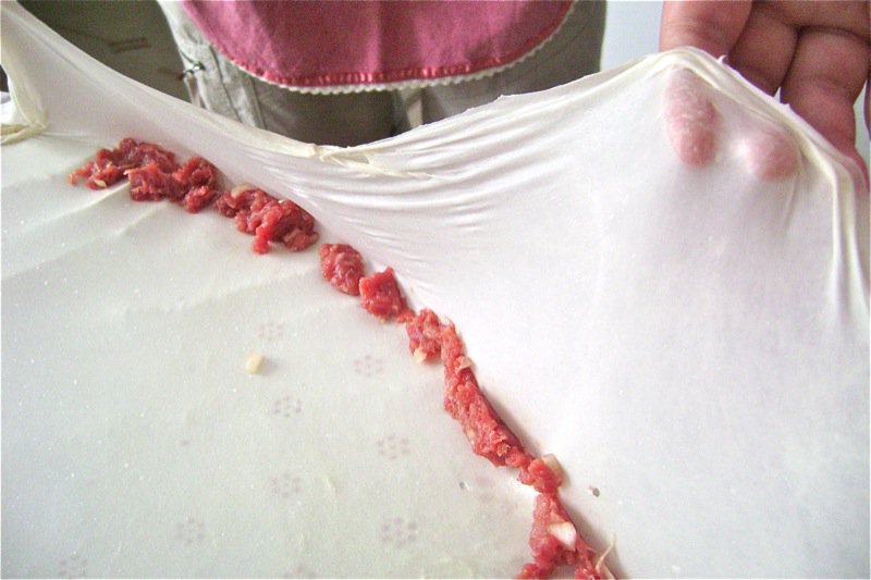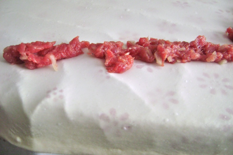 Elsada said I could put the meat around the edges. This was the easy part! Well, you still have to be very skimpy with the meat. Look at the quality of that beef. It is actually from a very young cow.