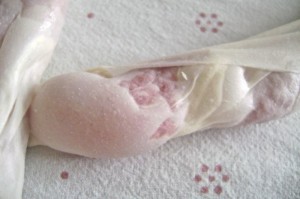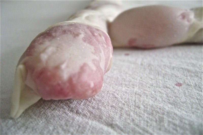 Later, she was able to show me dough that was not nice as it had clumped when it was being stretched. You can see this below. I would be thrilled with this clumpy dough. You would never know eating it… but, you would see it, I guess, on the outer layer, when baked.