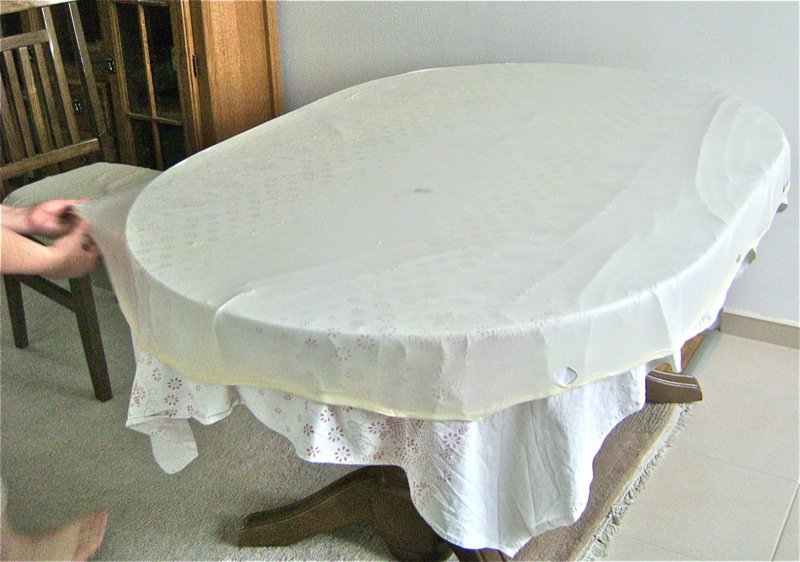 We work to stretch it over the table…. there we go.