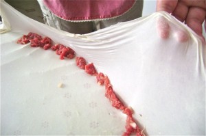 Now, the cloth is lifted on each side to enable the meat inside of the dough to roll over onto itself and form a roll. See how Elsada is doing it, below, right?