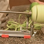 Christan arrived ready to bake: apron, knives, and miracle apple pie making tool… her apple slicer-peeler! I have seen these everywhere, but was not smitten. Contrary to what some may think (due to my consistent proclamation of undying love for my Thermomix) I am not a huge gadget person. I have effortlessly resisted buying myself one of these. How silly! I can peel an apple in 30 seconds. It takes me 5 minutes to peel 5 apples for a pie. Why would I ever want one of these.