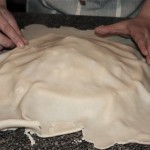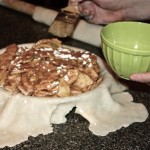 The filling is ready. Whew! It didn’t take long. After the sugar and cinnamon, in went a considerable amount of flour. How much? “It depends upon how moist the apples are and these are really moist. I will need a lot of flour.” She used enough to rid herself of the pool at the bottom of the bowl. It seemed like a full proof process to me.