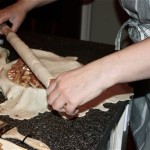 After a little discussion about how I made the pastries, we sniffed them, and then got rolling. I always use a pastry cloth and a sleeve on my pastries and my shortbread. It is just easier for me. She usually uses brown paper from bags. Makes sense, too.