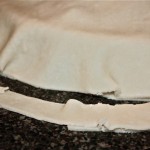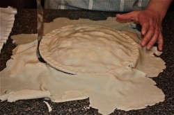 She forgot her rolling pin, and I only had one decent one. (It is not the one above.) We shared, rolling out each chilled disc to 1/4 inch thick, keeping a good dusting of flour (but not too much) under the pastry so it would life off the cloth easily.