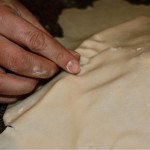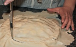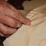She actually doesn’t cut her overlapping pastry until she has completely finished her gentle crimping. See how she does that below? Above her crimping, I do cut off the extra overlapping and discard it, then fold up the extra to make a more pronounced decorative pinched crimp.