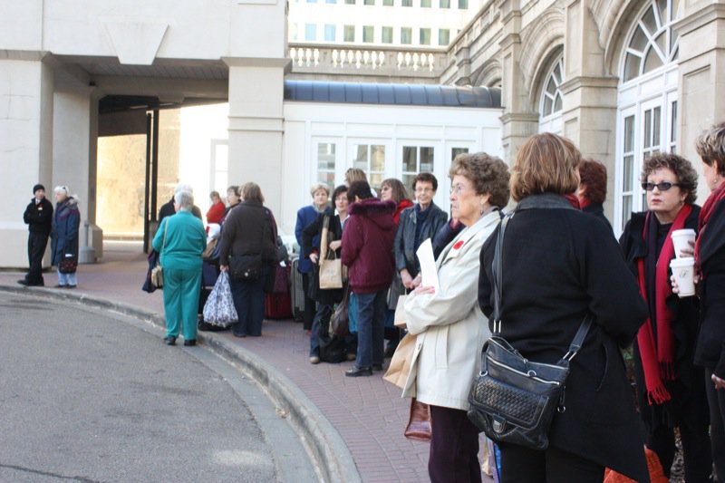 I decided to take one of the three buses arranged through CIN (Christmas in November) from the Fairmont Hotel Macdonald downtown. Too tired to drive and at this time of year there could be a massive snowstorm on the day I need to drive home. Luggage added to the line. Friendly check in faces! These people all came down from JPL to check us in today!