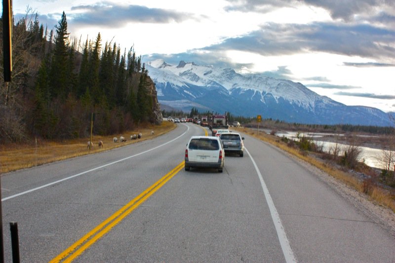 Mountain sheep: big horns. I have never seen so many animals on the highway at once in my life. Ever. This was very unexpected and incredible. They meandered in and around and through the cars from once side to the other then down the road and back.