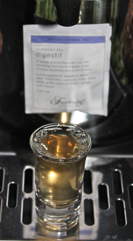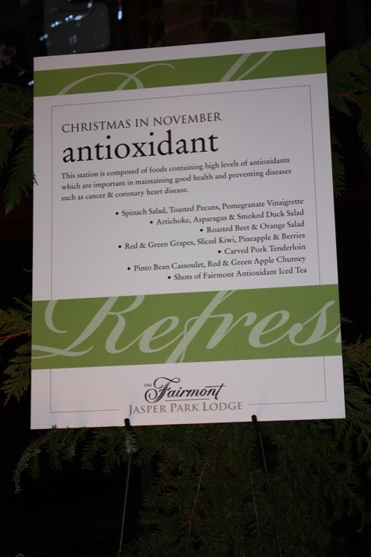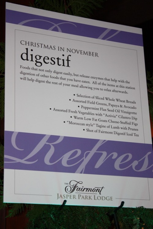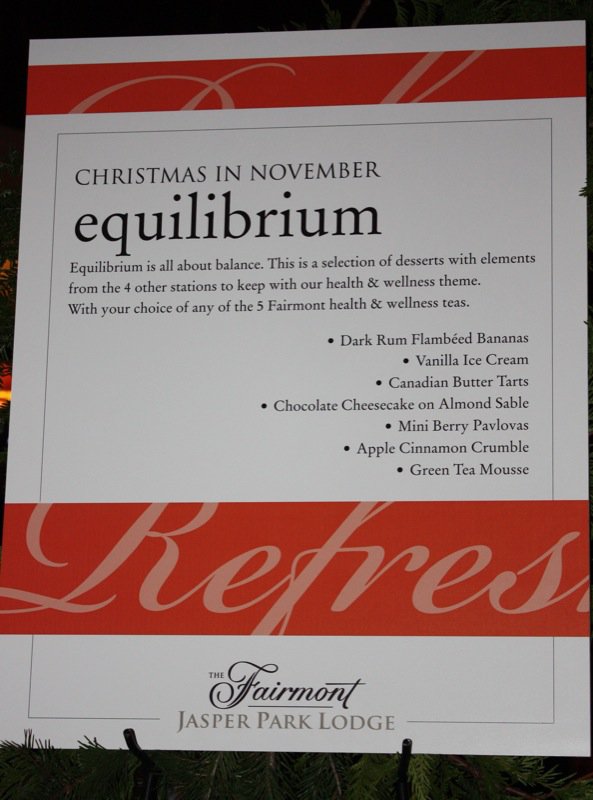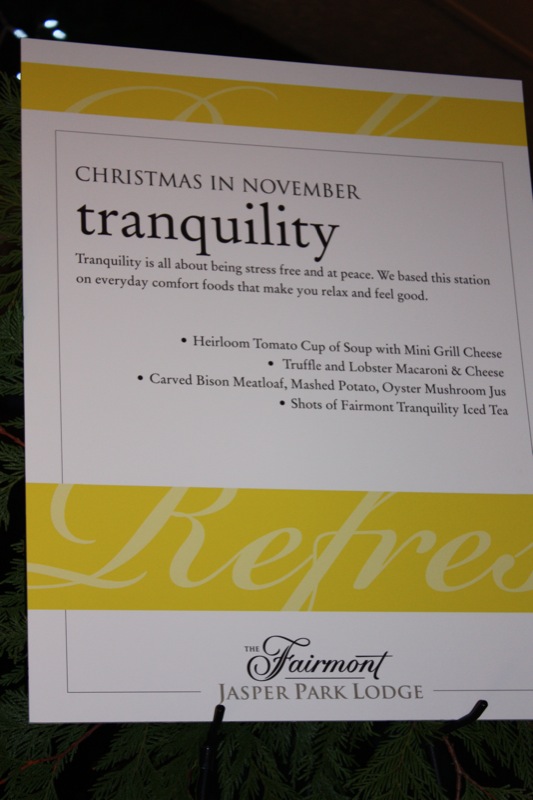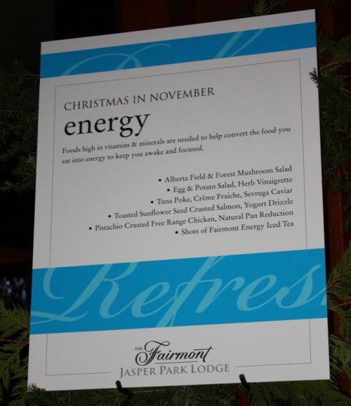 As the World Class Fairmont Jasper Park Lodge Spa just opened at the end of October with their Grand Opening scheduled for the 15 of November, the theme of the festivities for Christmas in November this year is Refresh! Derek Ingraham, Fairmont JPL Executive Chef, and his team, created the “casual menu” for our Welcoming Reception around this theme by developing 5 different menus: one for each of the 5 relaxation and revitalizing teas specially developed for this spa.