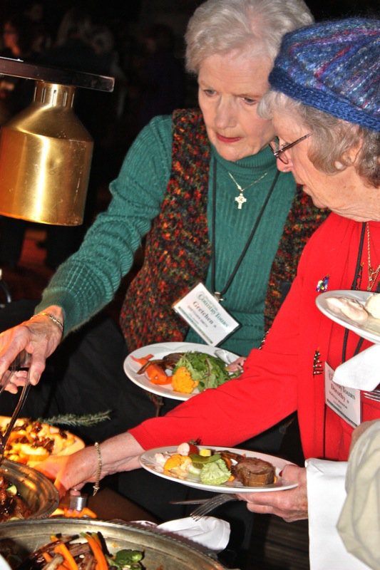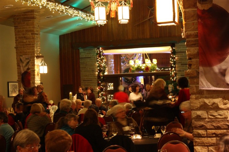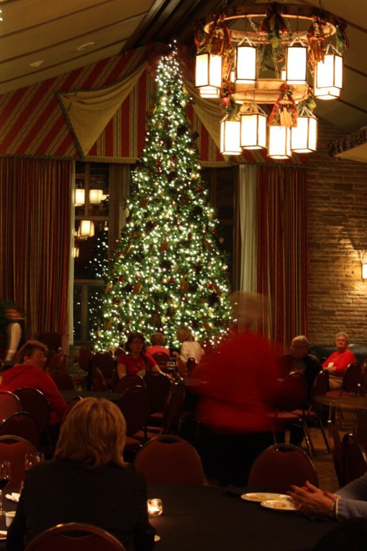 The setting was the main room of the lodge and into the formal dining room area. Dress was casual. Lighting was dim and romantic. Festive lights twinkled while carols rose from the piano in the back of the hall. Joy was in the air. Everywhere!