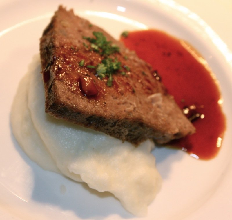 - Carved Bison Meatloaf on Mashed Potato with Oyster Mushroom Jus