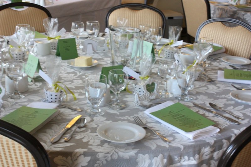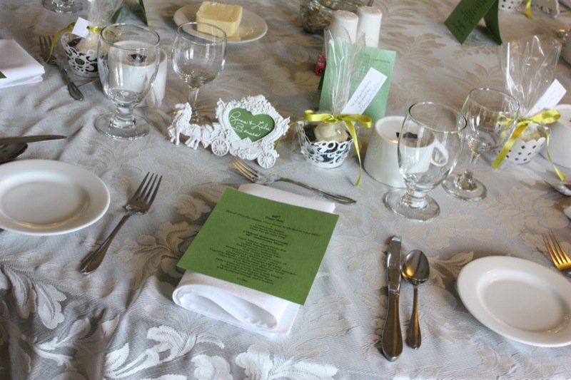Isn’t this a pretty table? The party room in mom and dad’s new condo was the perfect venue for our event. I have been doing wedding shopping, too, so found these sweet little Cinderella horse and buggy picture frames that we used as name cards and hid a picture of mom and dad behind for a take home gift. The “Thank you” cupcakes also served as a little extra table dressing as did the colourful menus.