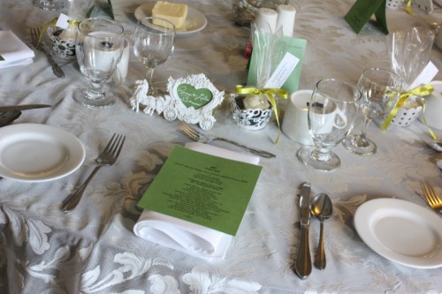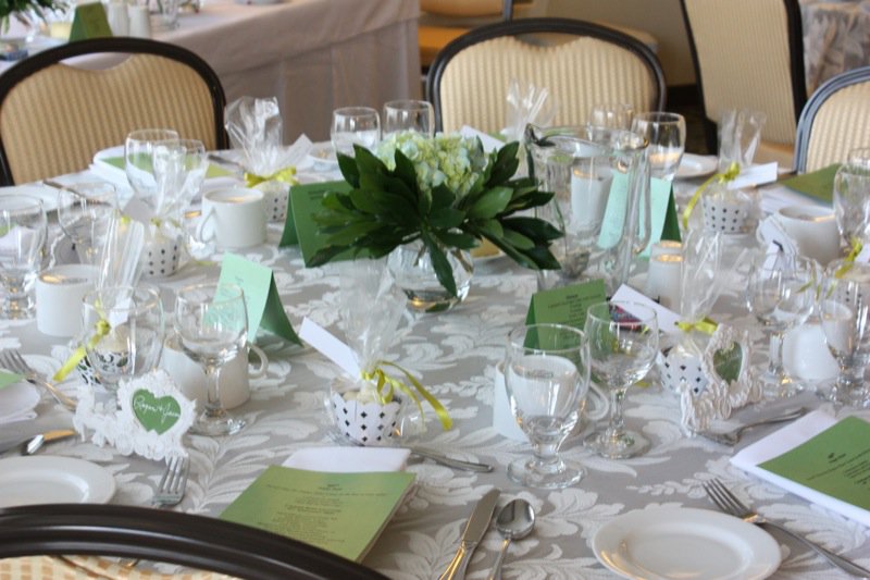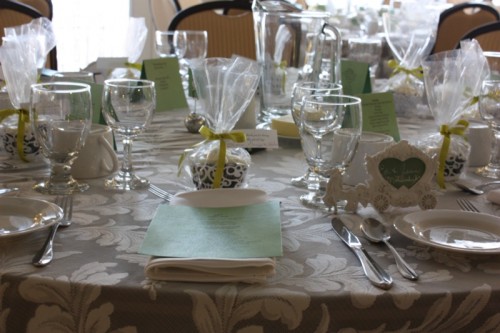 The ribbon and cardstock matched the original invitations, and though the flowers haven’t arrived yet, I was very pleased with the clean and sparkly look of the tables. If there was a couple, the nametag was placed inbetween them on the table (as above). The singles had their own placed above their place setting (as below).