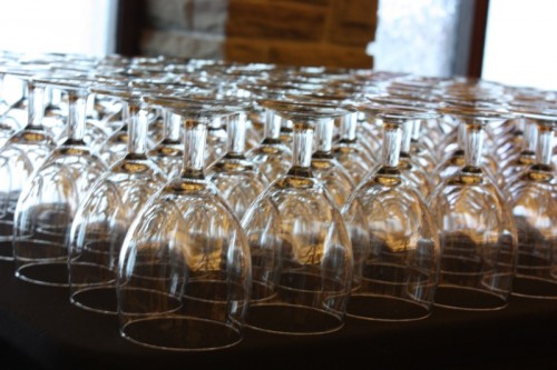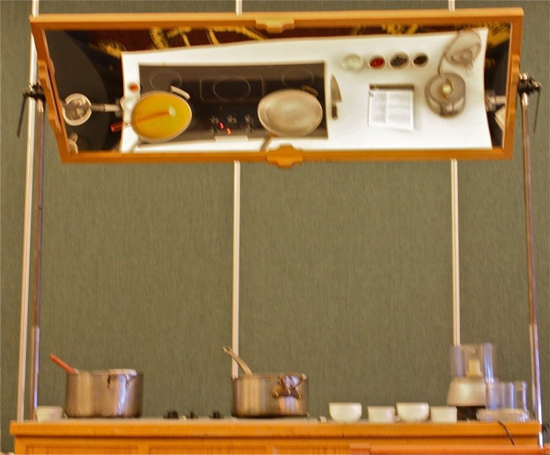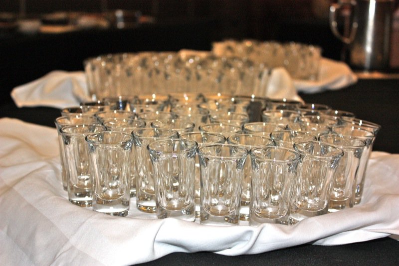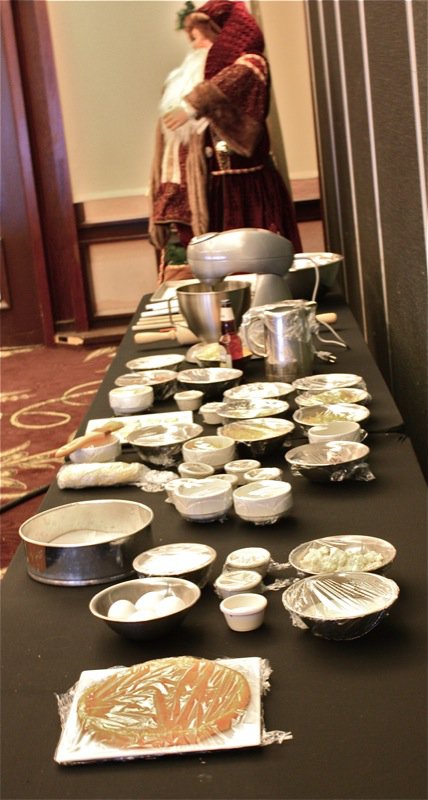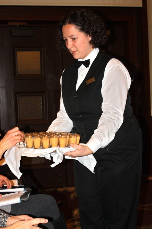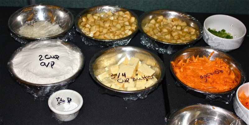 I realize the above picture is out of focus. No, it is not you. It is the only one I got of the demonstration table: exactly like mine, at school. OK. Not exactly. Mine does not have a stove in it, it is smaller and much older. But, I was in familiar territory. There was a multitude of glasses and frosty stainless pitchers filled with water.