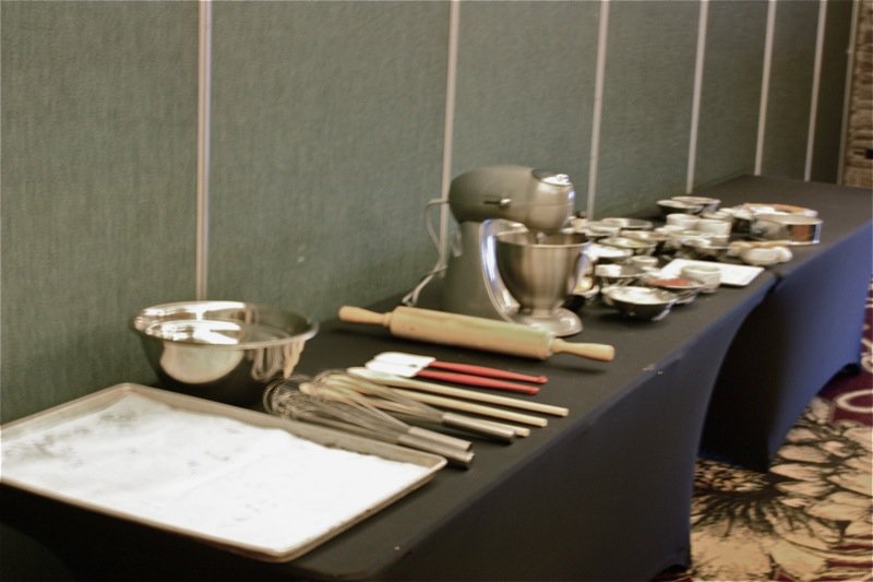 Michelle, the other gal that arrived later, was the only one at our table who had been here before. Though breakfast was over at 9 (many still lingered an extra 30 minutes over coffee and juice), and we had an hour before the first session, Michele said that they usually fill up fast, and it is best to get there in a timely fashion if you like a front row seat. Now, I am definitely a front row seat kind of girl. Grade one, on. I was there at 9:20. No one else arrived until about 10 to 10. Fortunately, I had my laptop and as a President’s Club Member, had free Internet everywhere on site. So, I answered my e-mail and took pictures of the mis en place while I waited. I was really looking forward to this session. I thoroughly enjoy Anna’s shows Sugar and Fresh on the Food Network. I was definitely intent on soaking it all in: camera and computer ready!