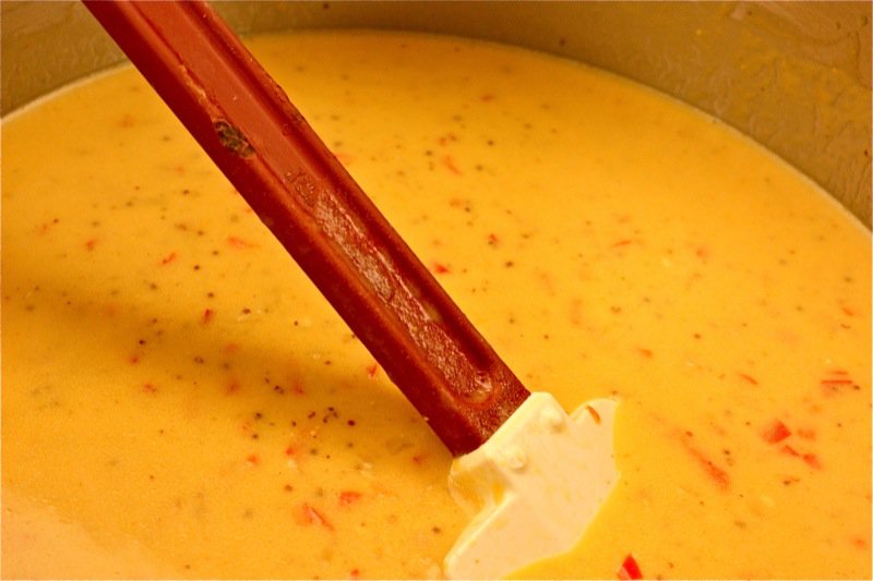 The base must be a roux base to add cheese to. You cannot add cheese to a soup properly that is not made with a roux base. “Instead of just a butter and flour roux, we will have an aromatic roux!”