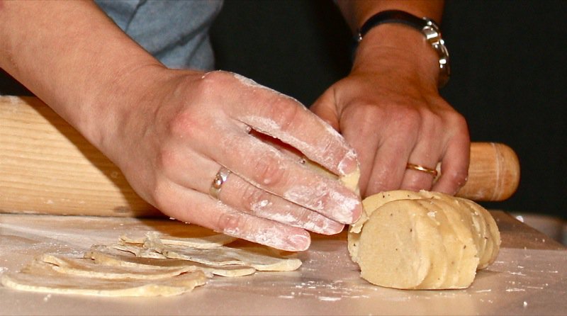 - On a lightly floured surface, with a small rolling pin, roll out each slice to just under 1/4 inch thick (about 2 1/2 inches across)