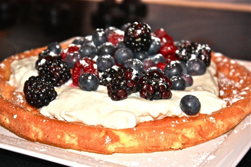 - Dollop cream over top of the torte into the fallen space left for the cream and the berries
