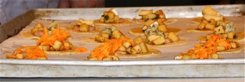 - sour cream and apple butter holds the apples in place (she plops it one) and now add the cheese: three different kinds equals 3 different appetizers, isn’t that great?