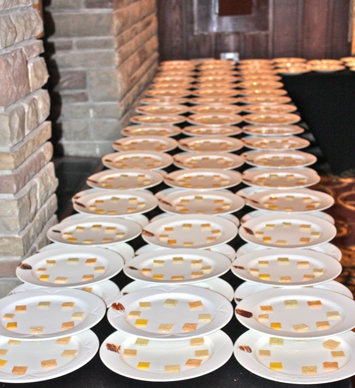 I did arrive early as I am prone to do to almost everything I am excited to attend. I liked the rustic nature of the set. The plates with little squares on them, below, perked up my curiosity. Hmmm?