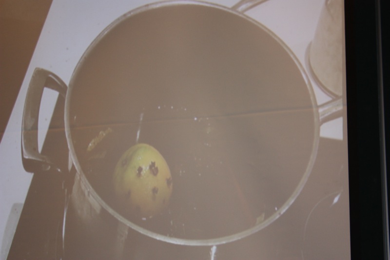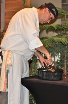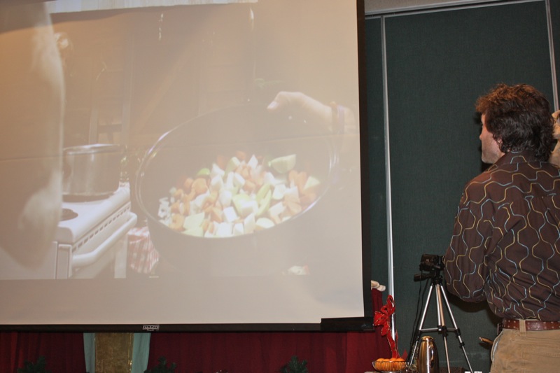 Setting the mood is key to everything. Michael Smith walks his talk. He is the quintessential teacher. Teaching the importance of cooking at home has become his life’s work. It is also my daily mantra at school: cook at home! Outside of his session, the aromatic scent of Christmas wafted through the air. Apple cider! Nothing says it more. Get your cup of Christmas and come in and site down in this homey environment set up to warm the soul. Before he opened his mouth, he had spoken volumes.