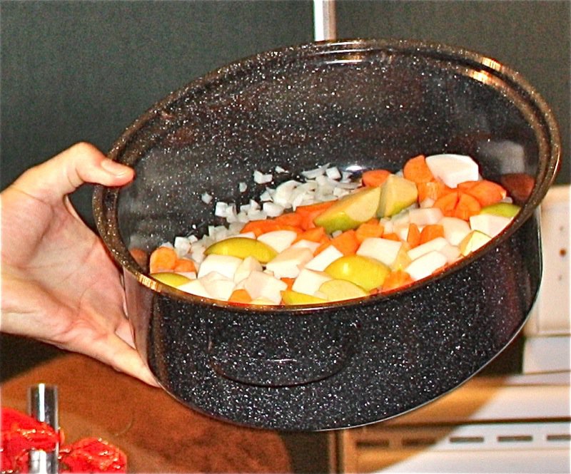 - Toss the first five ingredients in the bottom of roasting pan; season well with salt and pepper