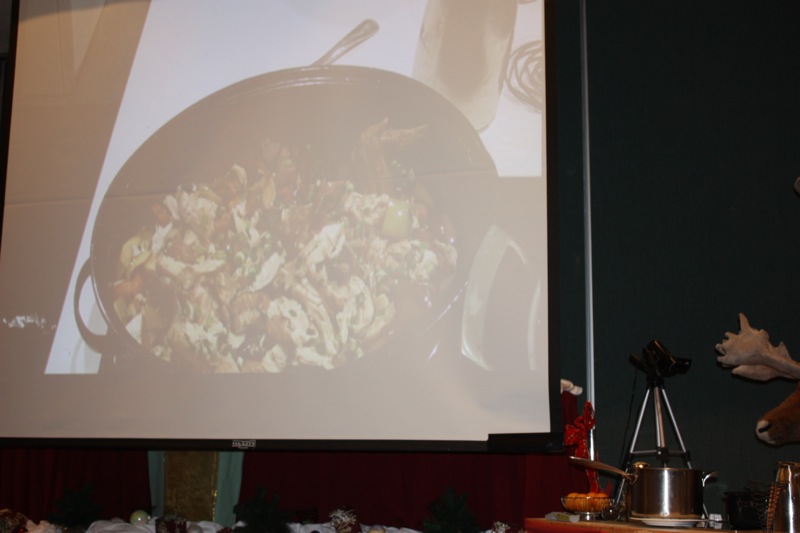 He started with his personal story. A bit of it. This has been his 12th year to Christmas in November (unlike the information in the Scavenger Hunt on the bus here!) and he is the host! The photos on the screen when we came in were his from his new cookbook that will be published in the fall. He said that he finds when he is in Jasper each year that he is inspired to write a lot here. The setting inspires his work and that it is wonderful to “œbe the cook” over Christmas, as it is so important!