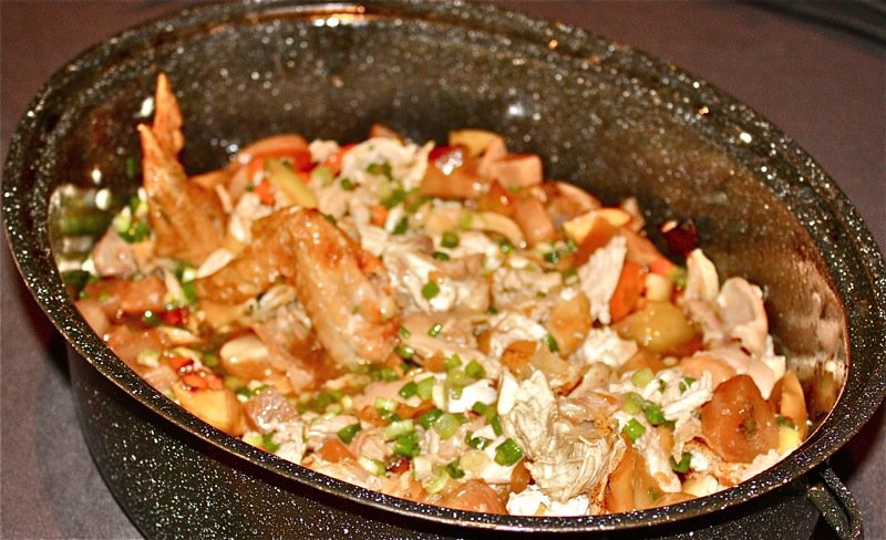 - Rest the meat in the pan, lid off; when cool enough to handle (10 to 15 minutes) slice, cut, pull shred, tug and otherwise remove the meat from the carcass (leaving the wings as they are with the pan stew)