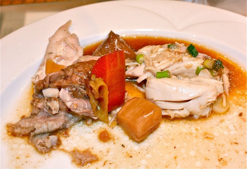 And, as Michael said, with the magic of Food Network, here is our roasted chicken… all ready after one commercial break! At this point, he took the help and demonstrated his pulling apart of the roasted chicken. there wasn’t a knife in sight. Well, maybe there was, but he literally pulled it all apart: bones in one pot, meat, skin and wings on top of the apple mixture, then tossed it together. See it below?