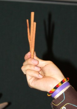 - (Holding up cinnamon sticks, he asks) what are these for? Nothing! Garnish: in they go. There is no other reason to have them in the kitchen, except for garnish (Though, the Spice Goddess may disagree)