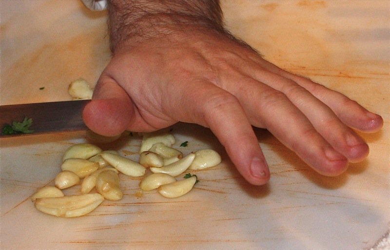 - Finely chop garlic, shallot, and onion; set aside in a small bowl