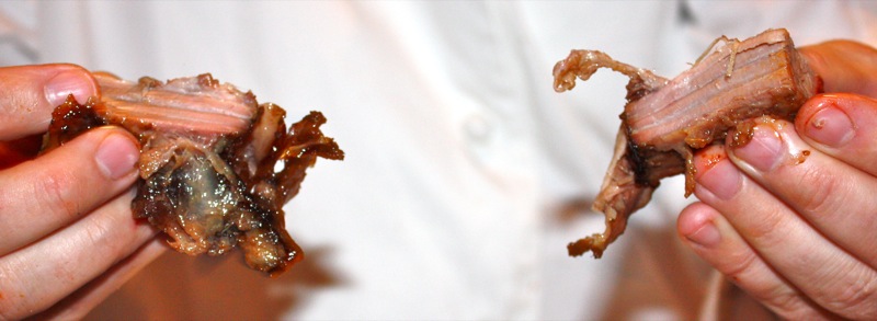 - Finish it with a barbecue sauce of your choice: buying a bottled sauce that is basic and cheap and take it home and add brown sugar and onions and herbs and spices or whatever to it (Valerie: I add chipotle and horseradish to Cattle Boys sauce when I don’t have time to make my own)