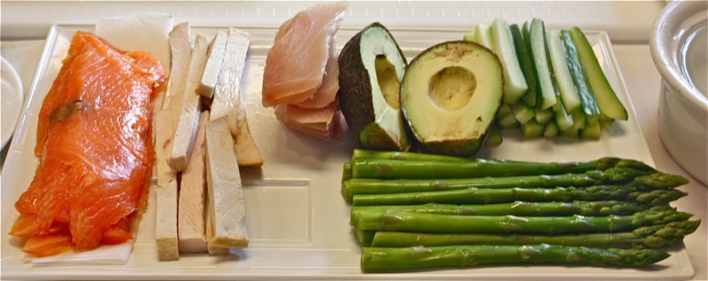 Turn it over and place fillings on top: cream cheese, turkey and cucumber. I was surprised by the choice of cheese. I thought a cardinal rule was to never serve cheese and fish together. I asked Chef about this and he shrugged and said that he had just thought up this combination. Essentially: if it tastes good, why not? It was delicious.