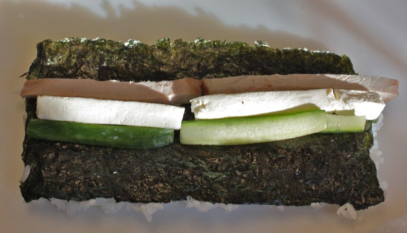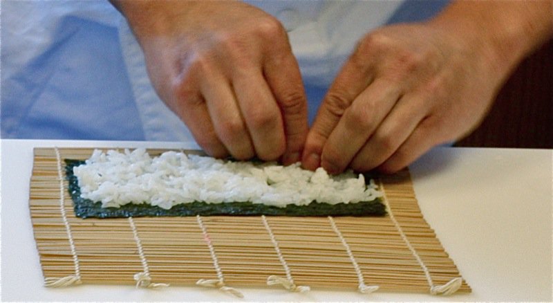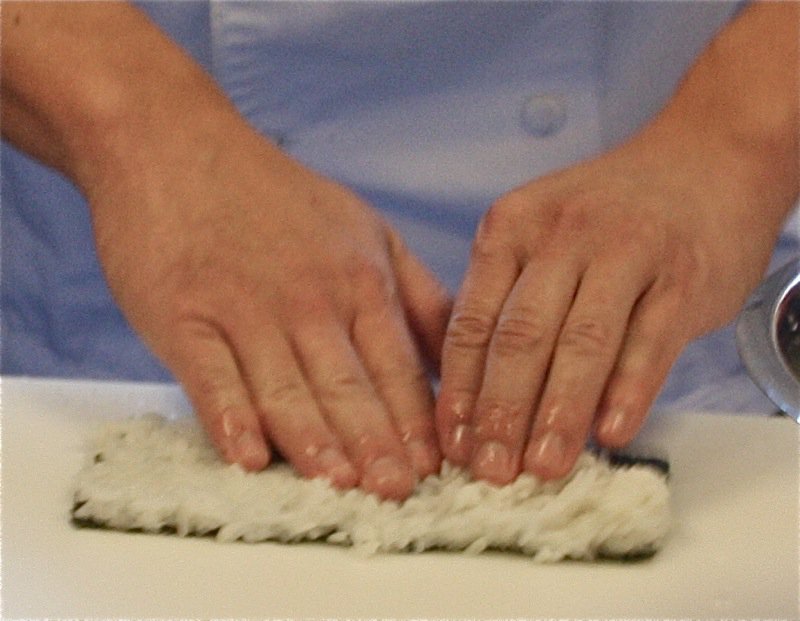 Place it across the top of the rough side of the nori (smooth side down) and gently move the rice down across the nori: to not pull it or press it.