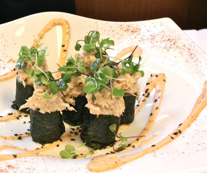The spicy mayo went onto the plate and then he plated his rolls. What is in the bowl? Crab!