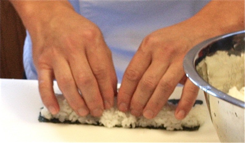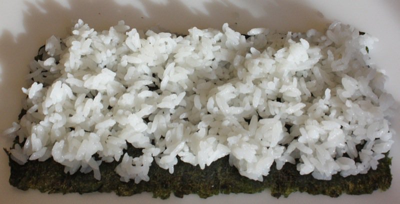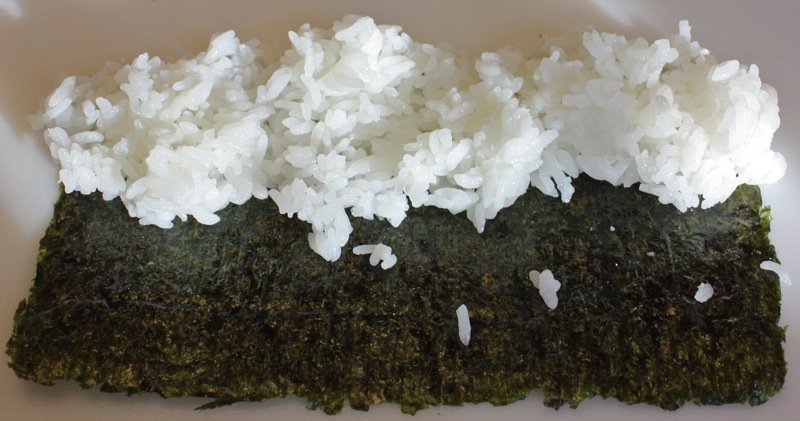 3.    Place the rice across the top of the nori, then take it from the top and move it down: do not press it down; do not touch it too much