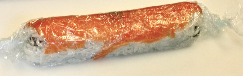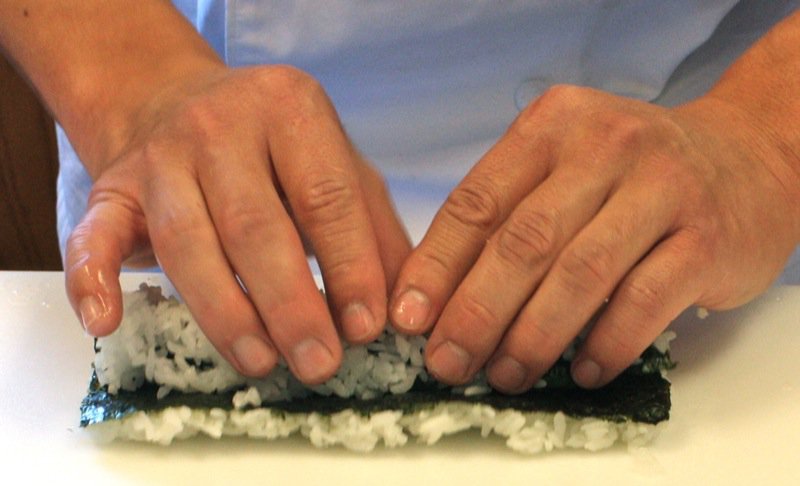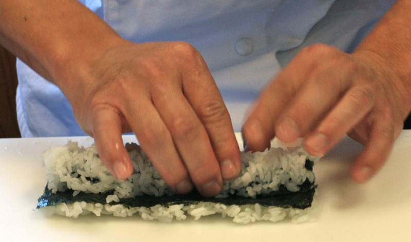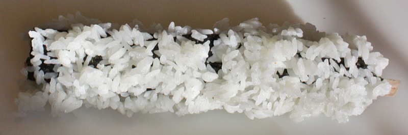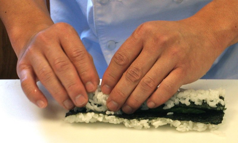 Turn to tuck in leaving no space inside. I found it easy to do this, but could see I didn’t have enough rice on the outside. He assured me it was fine.