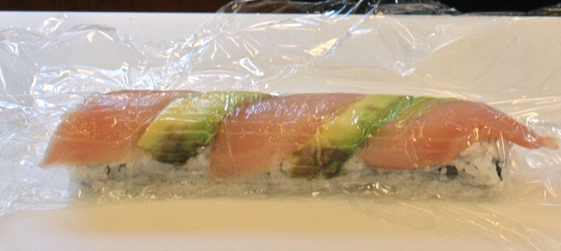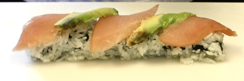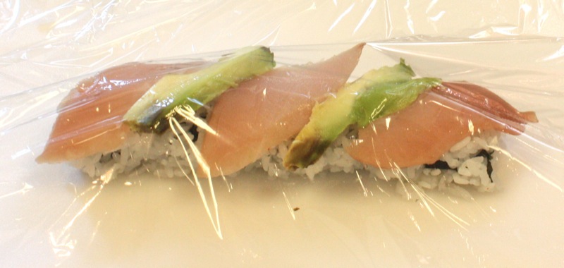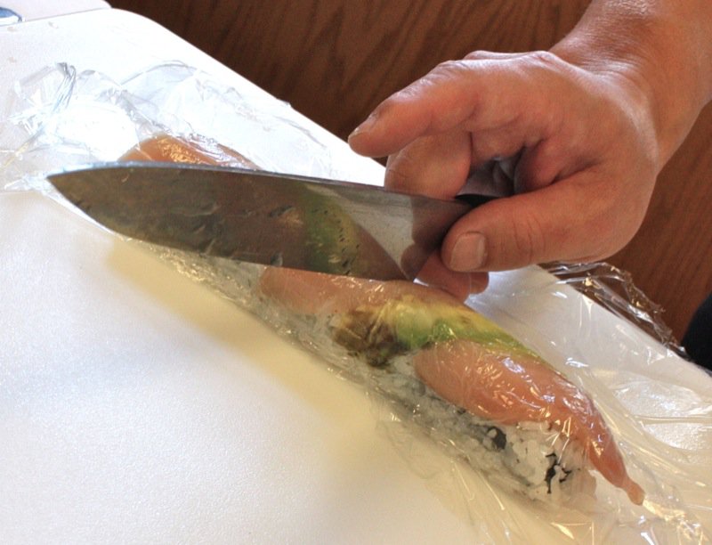 - Use the back part of the knife to cut as that is usually the sharpest, leaving the wrap on, at a 45 degree angle, gently slice it down : six slices (you want avacado and fish on the top of each)
