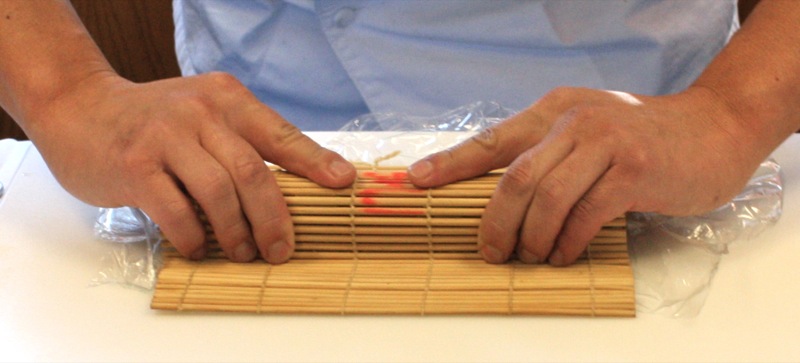 With both hands, forefingers outstretched, others wrapped around the mat, gently shape the roll.