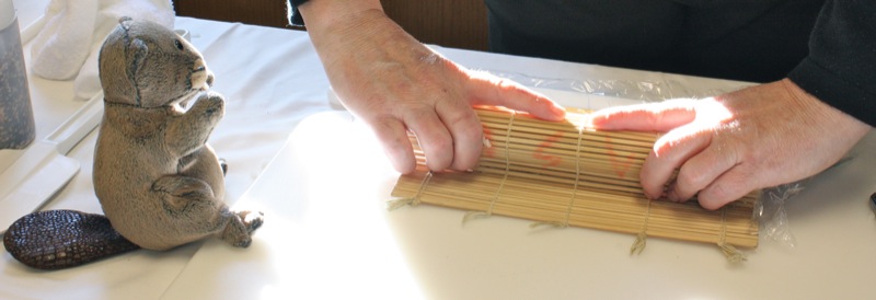 12. Throw rolling mat on top; use your thumb at the back of the roll and the mat (closest to you) and apply just a little pressure toward the roll; Then, with your index fingers on top, and the others around the roll, using a very light touch, but enough to shape the roll. Remove the mat.